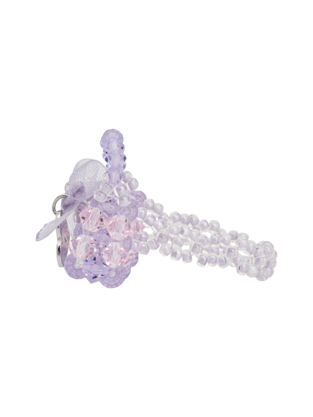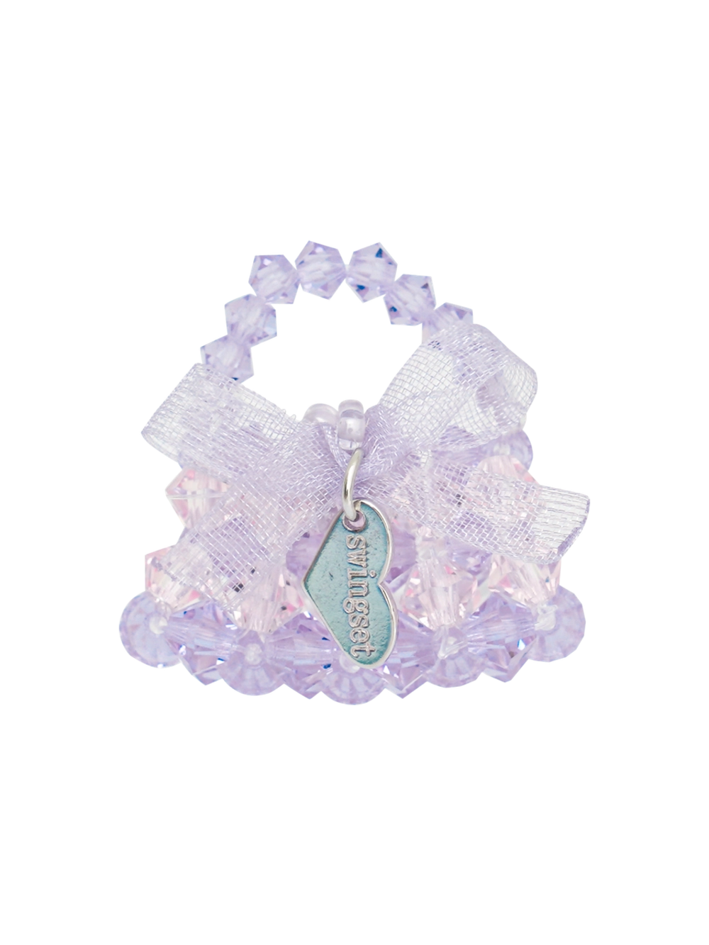 A bead bag-shaped ring with a crystal handle and an organdi ribbon decoration on top of a cute Swingset heart charm.