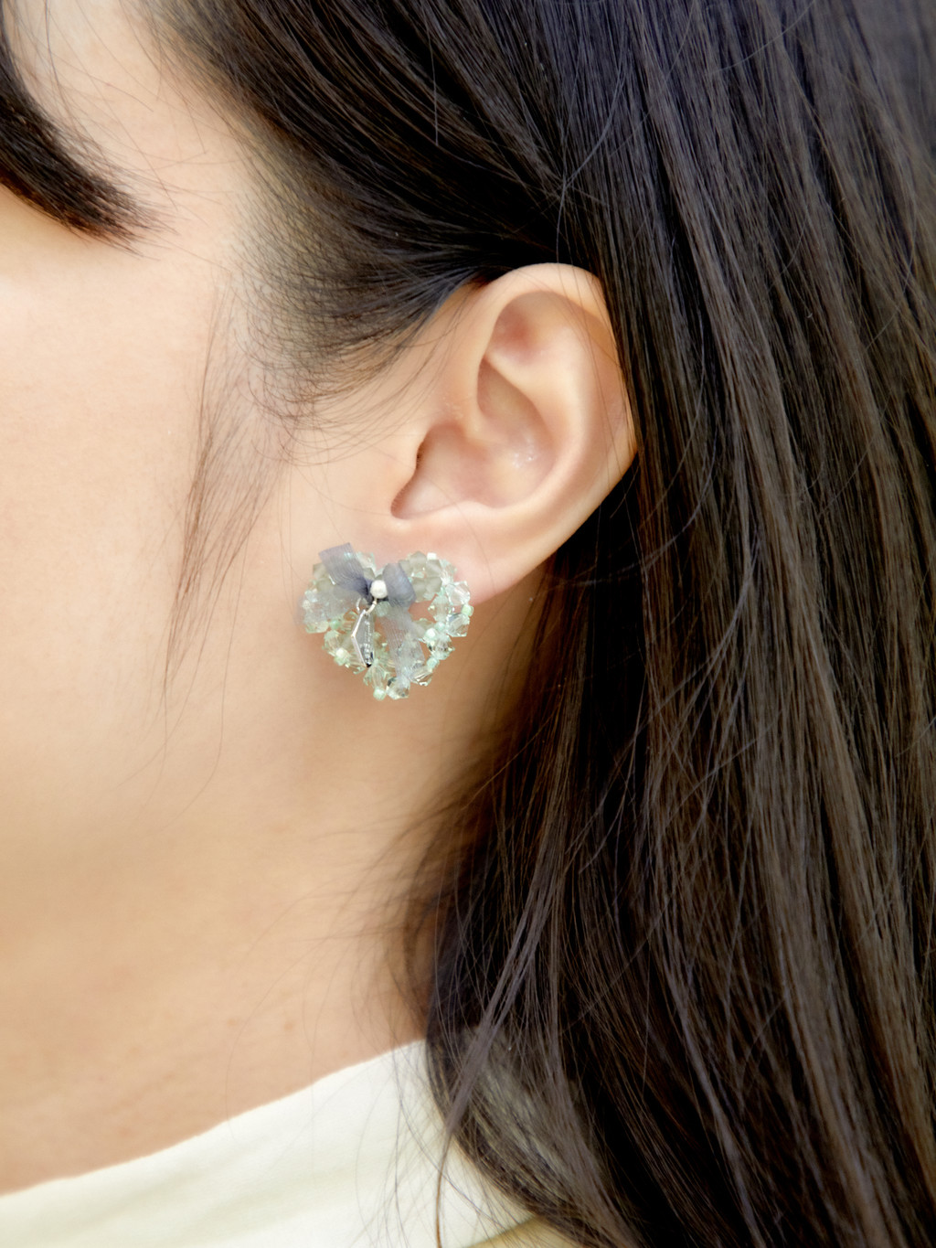 It is a lovely beads earrings made with pearls after layered with beads and organdy ribbons on top of a delicate open heart. The heart Swingset logo charm is point finished, making it even more lovely.