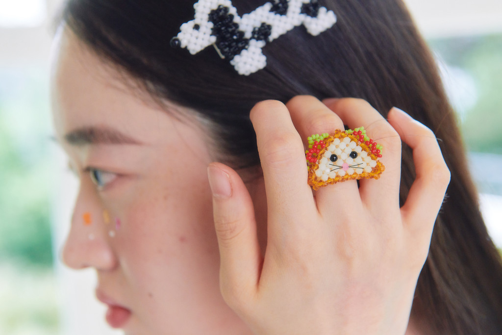 This beaded ring features a cat that turned into a “Sandnyangwich” while eating a sandwich.