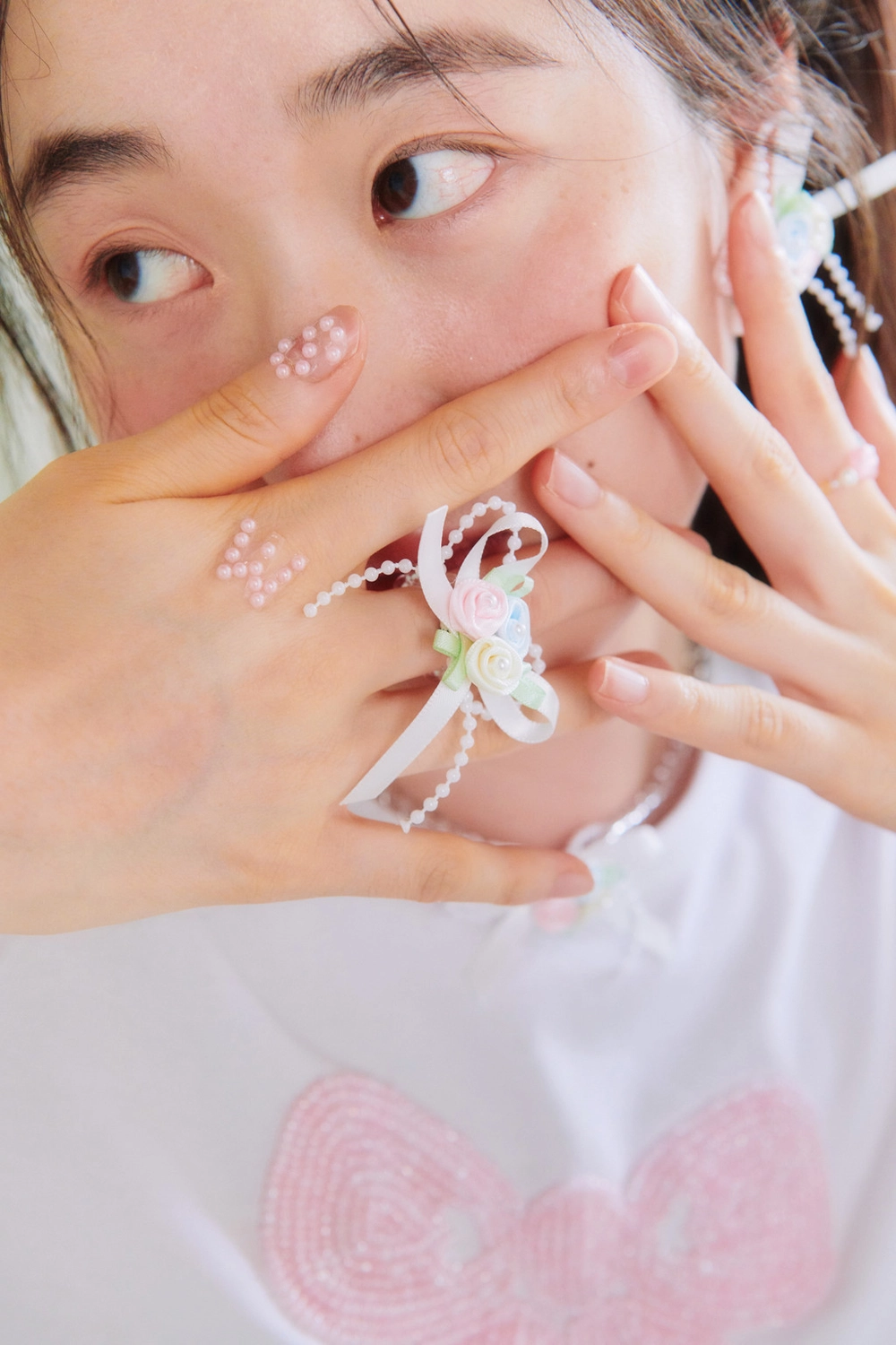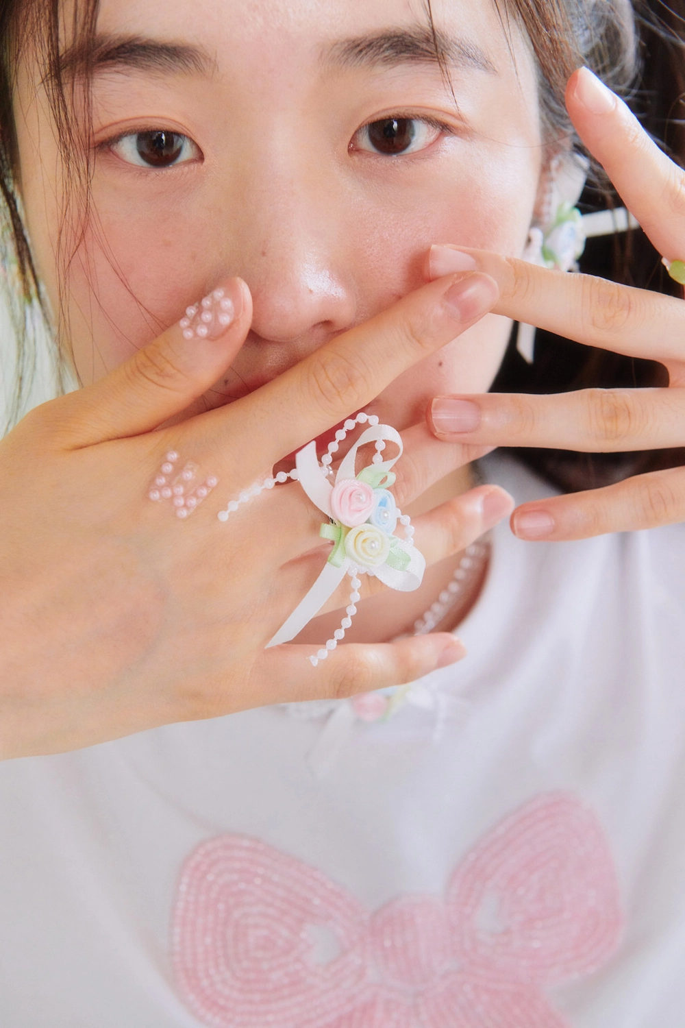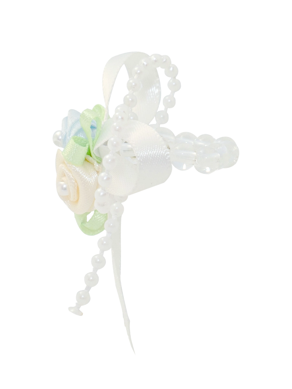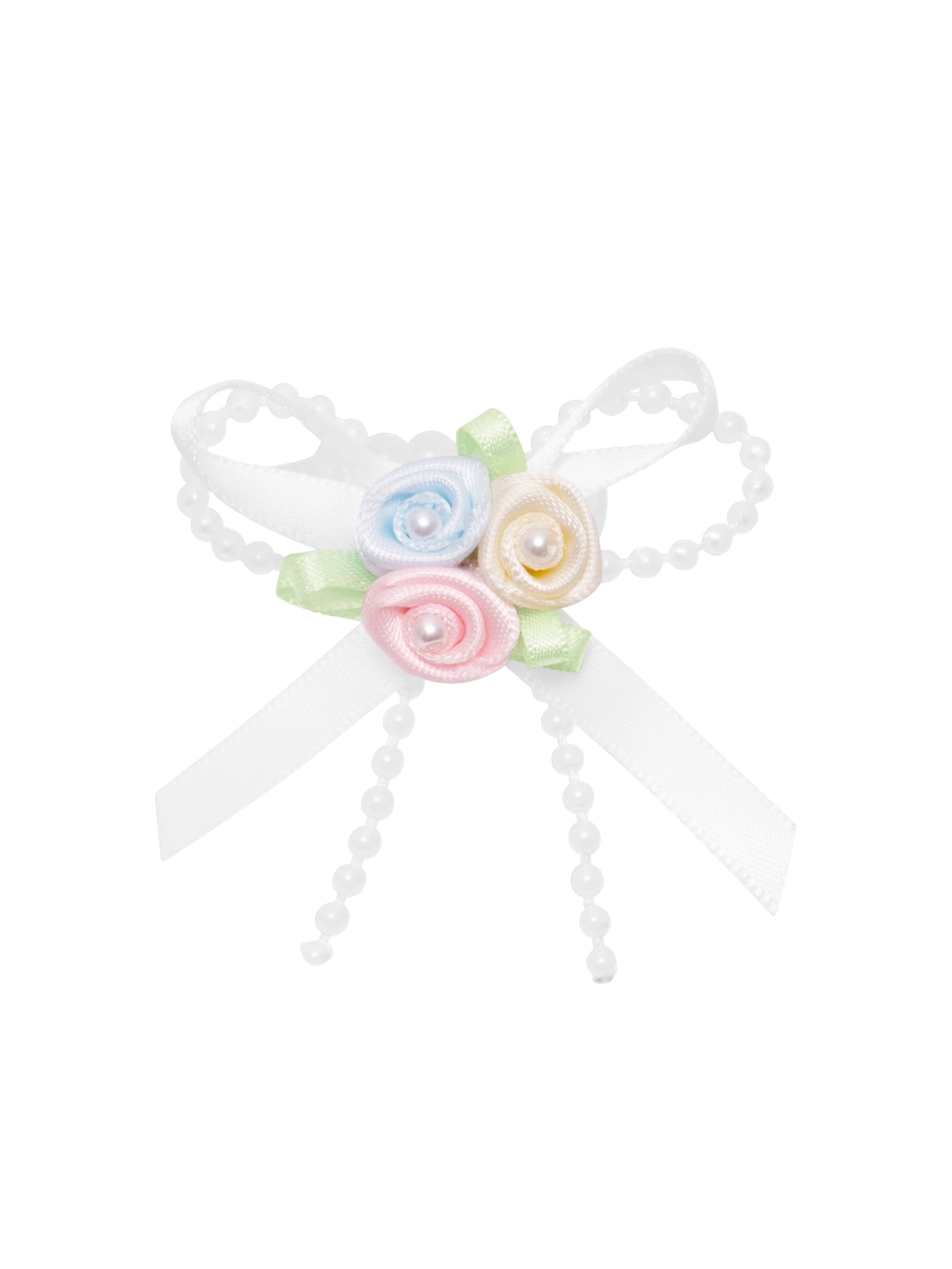 A lovely ring adorned with small pastel-toned rose decorations, complemented by white satin ribbon and pearl details.