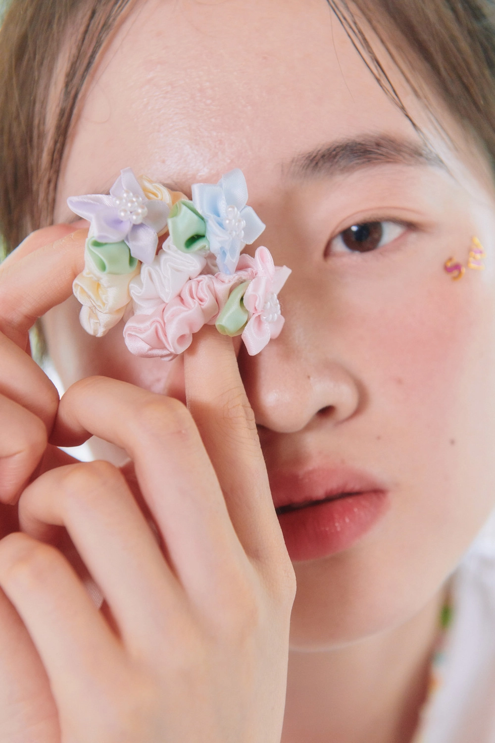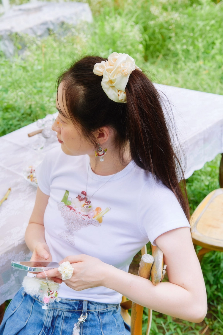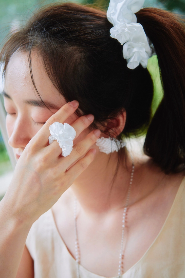 A unique finger scrunchie designed by resizing the original hair scrunchie to fit finger sizes, making it versatile as both a hair accessory and a ring.