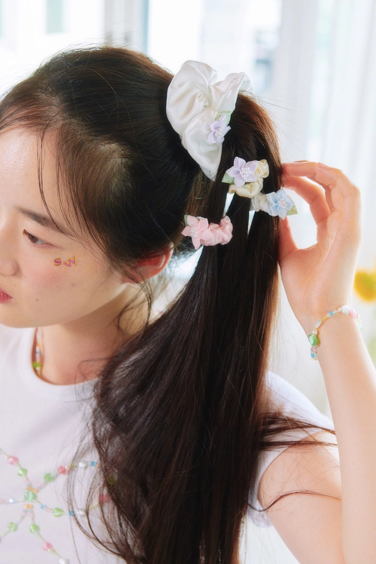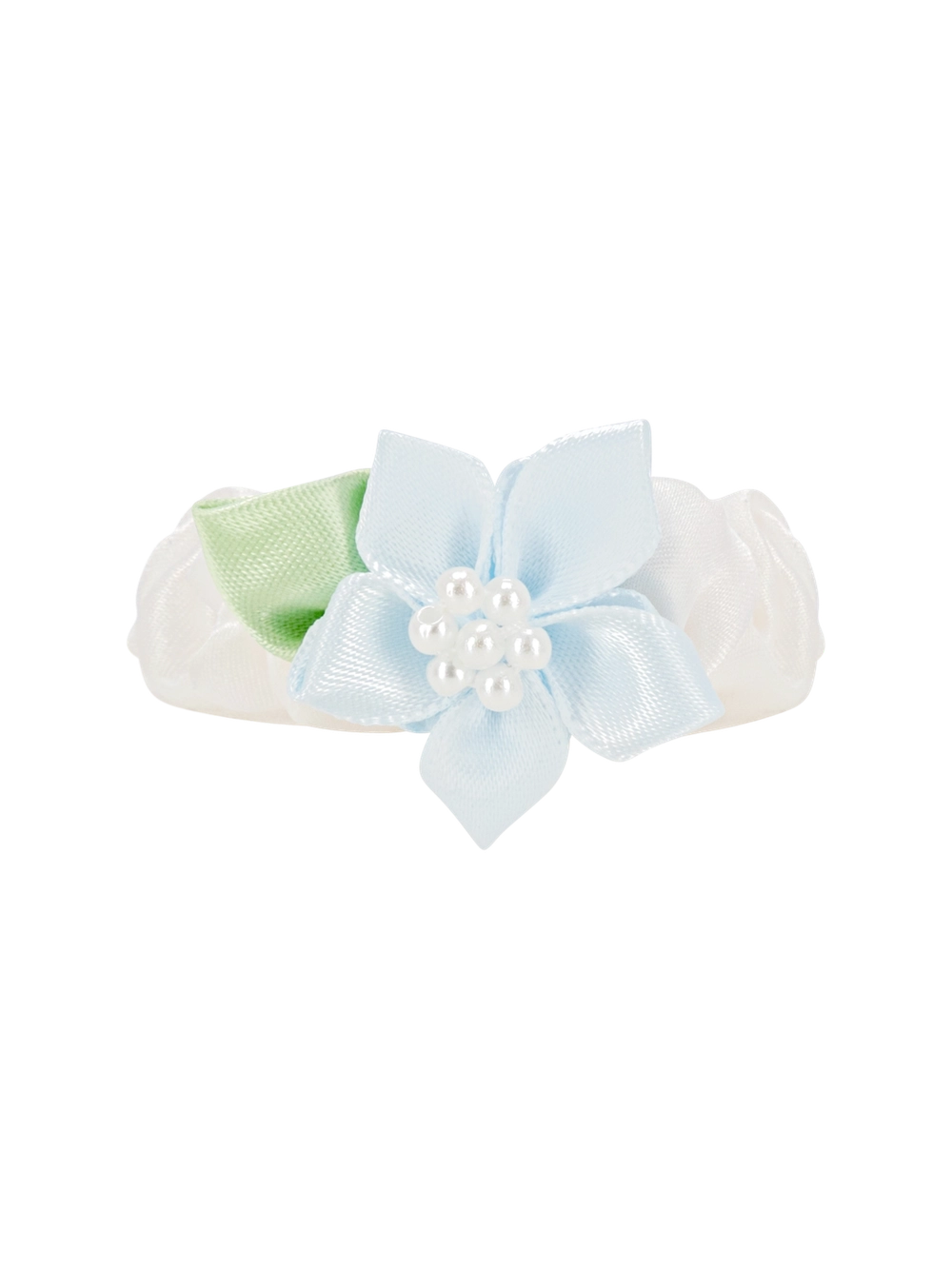 The piece features a flower decoration made with satin ribbon on a 100% silk band, adding a delicate touch.