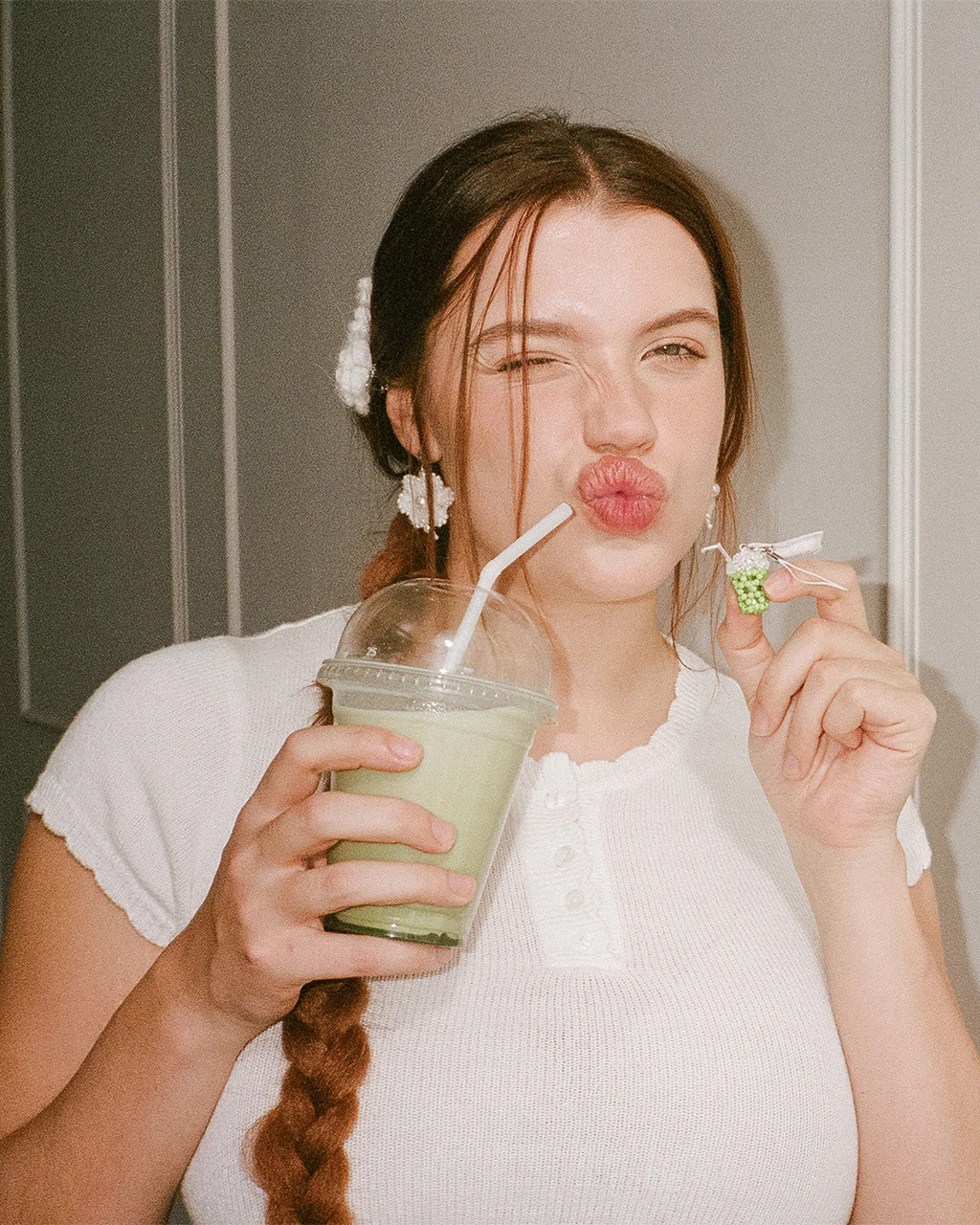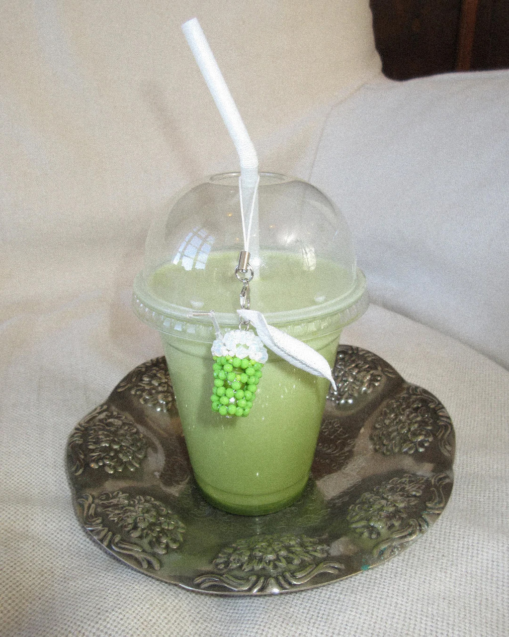 • Pearl beads inside represent ice, with a lid-like top and a cup-shaped bottom filled with matcha